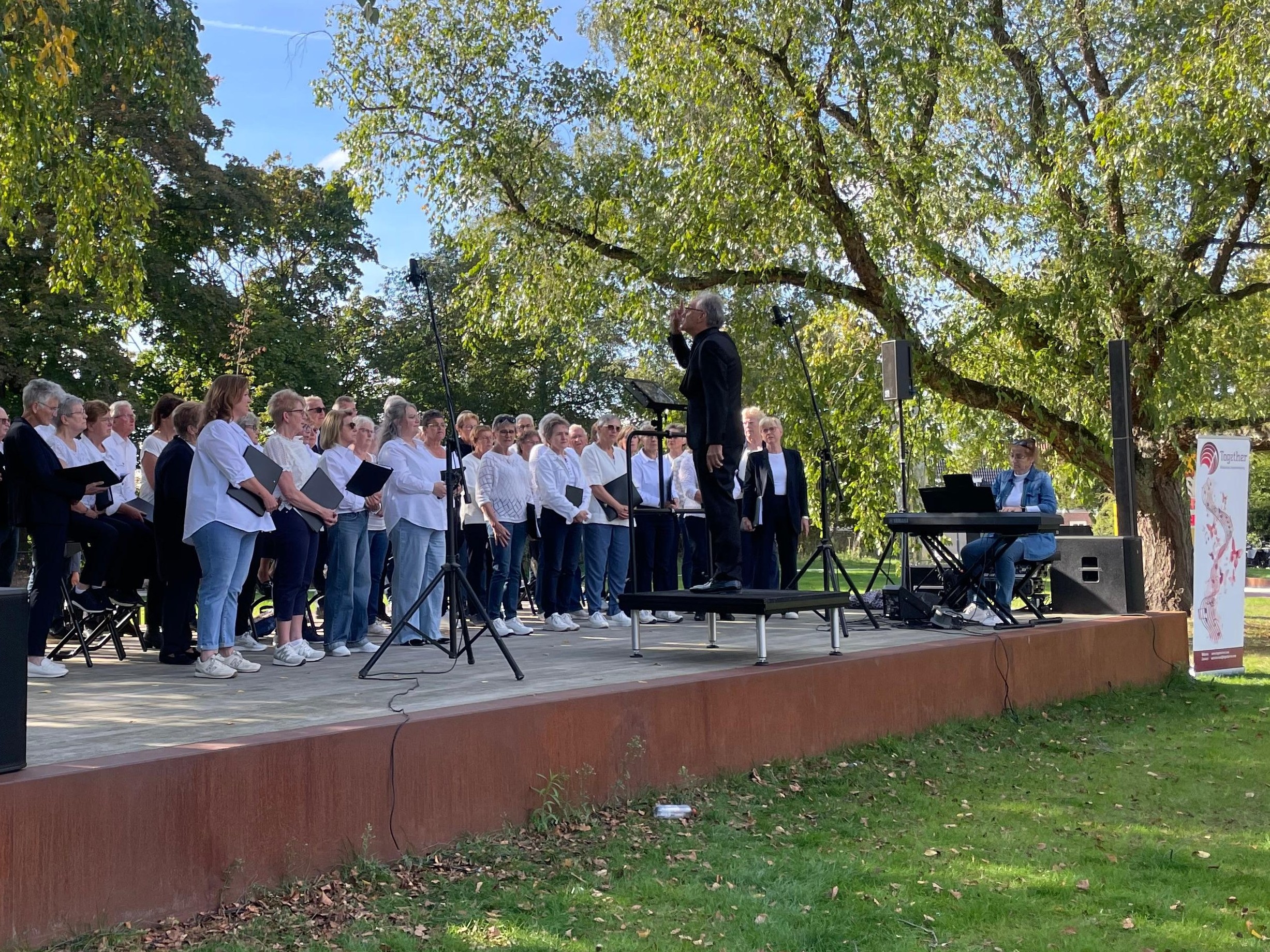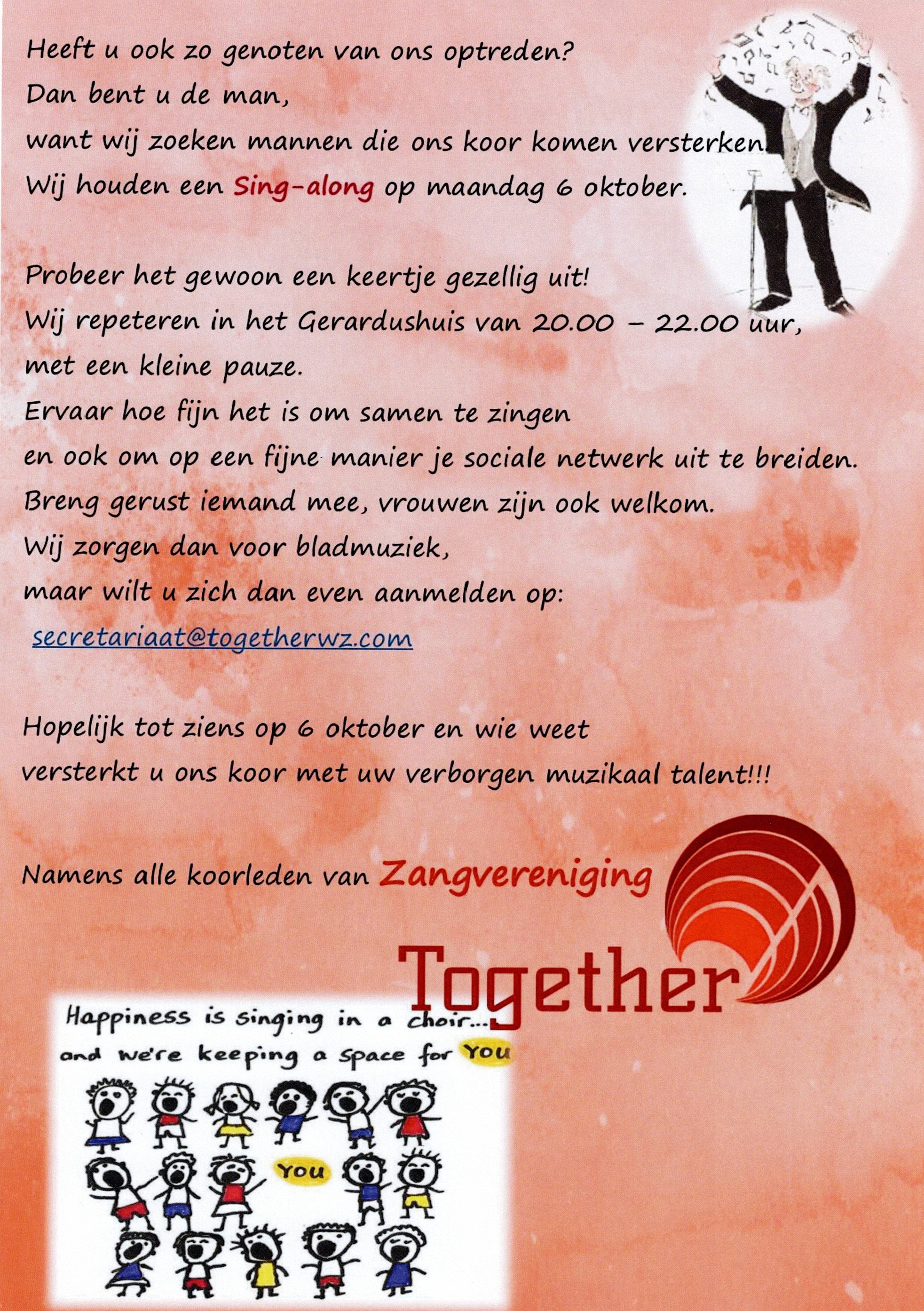 Na het concert neemt Rob nog even het wooord om het publiek te bedankt en hen te wijzen op de Sing along, die op maandag 6 oktober gehouden wordt. Onze mannen zijn erg in de minderheid en daar willen we graag wat aan doen. De leden van Together gaan gewapend met een uitnodiging het publiek in en wij hopen, dat hier respons op komt.